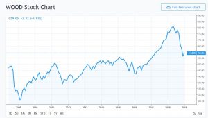 Como podemos observar , el índice WOOD tiene una discreta tendencia alcista durante su postulación como indicador. Tuvo un magnífico movimiento a la alza a partir del año 2016 hasta finales de 2018 donde alcanzo records historicos con una cotizacion de por encima de los 80 dolares americanos (USD)por contrato. Actualmente (Principios del 2019) se encuentra en un período de corrección a la baja, con una expectativa ante una posible crisis financiera que pudiera colapsar drásticamente su precio.